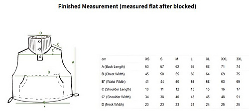 Needle Sizes: US 10.5: 6.5 mm (body), US 10: 6.0 mm (Picking up stitches, Body hem), US 7: 4.5 mm (Neck Collar, Button Band)