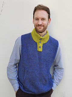 The construction begins with the back panel, worked flat from the neckline down. Once the underarm is completed, stitches are picked up along the shoulder line to form the front panels and shape the neckline. Finally, the front and back panels are joined at the bottom of the sleeve hem and body is then knit in the round to finish with front pocket. Once body is finished stiches are picked up and knitted to form collar.
