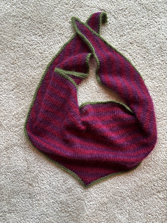 The VERSA shawl is the perfectly shaped triangular shawl with horizontal stripes. It is knit from the bottom up, starting at the apex and working toward the longest side, in an all-over four-row stripe pattern. All three sides of the triangular shawl are finished with a tubular edge in a contrasting highlight color.