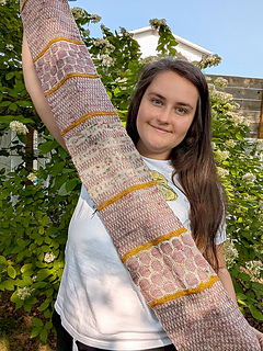 The scarf comes in one adaptable size and can easily be modified depending on the yarn you choose — follow your inspiration for fiber and feel. Several finishing options are included, allowing you to customize the final look to suit your style or mood.