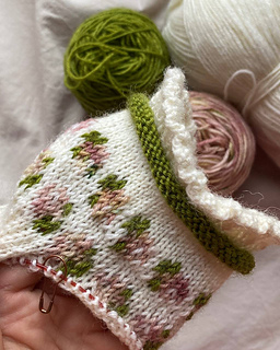 In my version, I used Alize Superwash Comfort Socks (hand-dyed hanks, color PEONY PINK) and Drops Fabel color 100 (White).