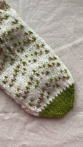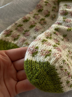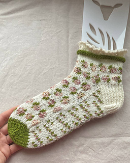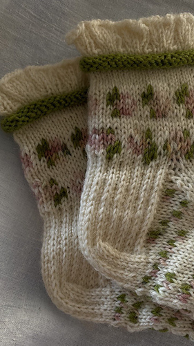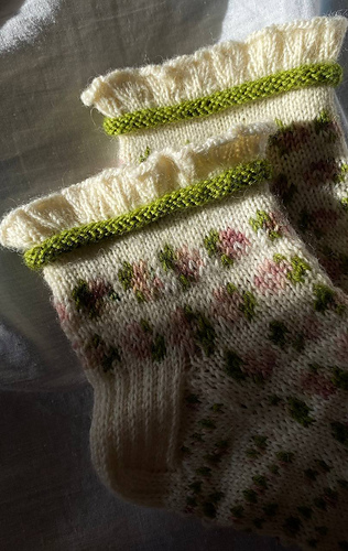 The socks are knitted from the ruffle to the toe. The process consists of several parts: working the ruffle, the roll, joining them, then the leg, the reinforced heel, the gusset, the foot, and the reinforced toe.