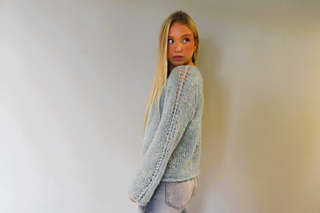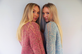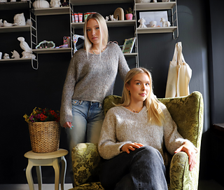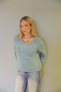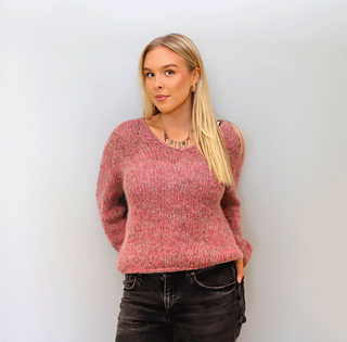 Viðja is a beautiful and stylish sweater for adults. The sweater is knitted from the top down. At the beginning, it is knitted flat (while the V-neckline is shaped) and then joined to knit in the round. A lace pattern decorates the sleeves.