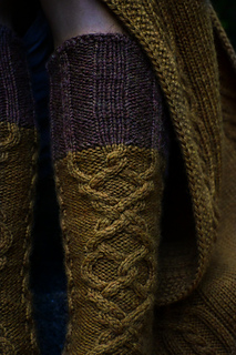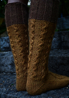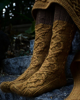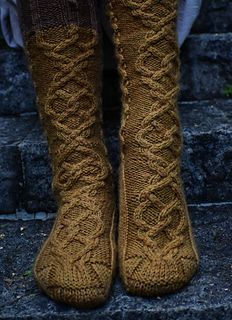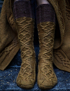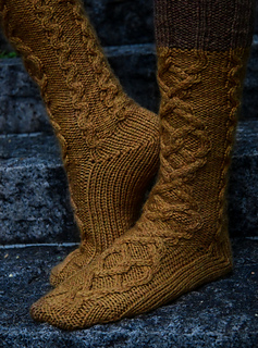 Viking runes feature a large braided cable in the front and smaller cables in the back leg after heel. Although they might look very complex the pattern itself is relatively easy to work.