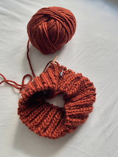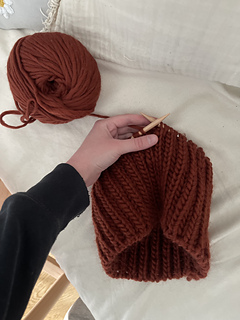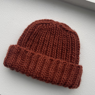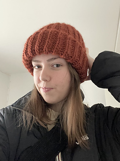Vilma huen er en chunky patentstrikket hue. Huen strikkes rundt i patentstrik på pind 7 mm.