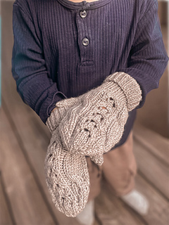 A thumb gusset is created on the palm side, with sts held on scrap yarn until the thumb is worked at the end. The top of the mitten is shaped with symmetrical
