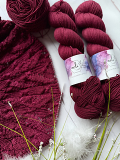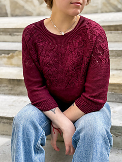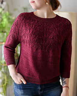 Vinelia ist ein nahtlos von oben gestrickter Pullover mit geripptem Halsausschnitt, der in eine Spitzenpasse mit Blattmuster übergeht – wirkungsvoll, dabei angenehm einfach zu arbeiten.
