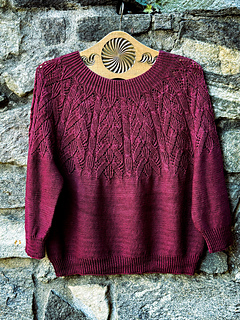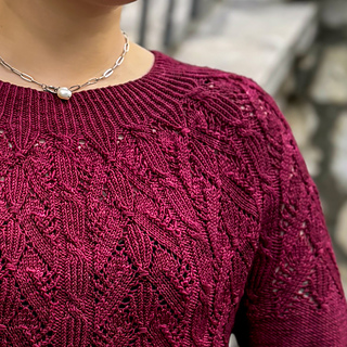 Vinelia is a top-down seamless sweater with a ribbed neckline that opens into a lace yoke, a leaf pattern that’s intricate to look at but easy to knit.