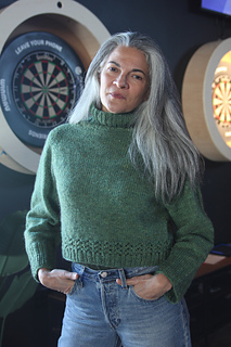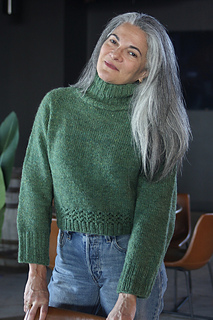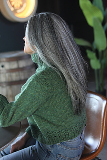A heavy worsted or Aran weight yarn works best for this pattern. I suggest a soft wool or a wool blend to provide stability along the seamless yoke. I like a Cormo, Targhee, Rambouillet or other lofty fiber for this, or a wool blend (up to 35% of a softer fiber with wool) would add just a bit of drape, while also preventing growth over time.