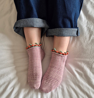 I used Lay Family Yarn sock yarn. I used Dusk (purple) for the main colour, 94 (green) for CC1 and 88 (orange) for CC2.