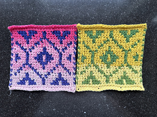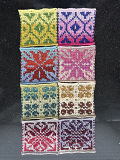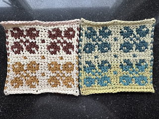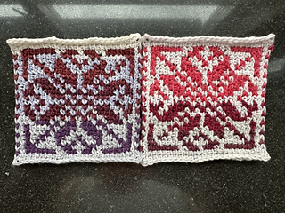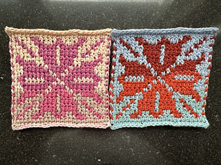The Vintage Norwegian Tiles designs are made in Tunisian crochet with a Mosaic technique, there are charts for knitting and stranded Tunisian available as well! (Please check my Ravelry store)