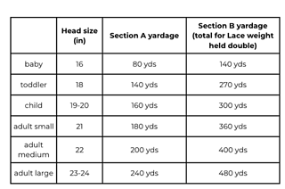 YARN - more details for the yardage for each size are shown in the chart in the photos to the right
