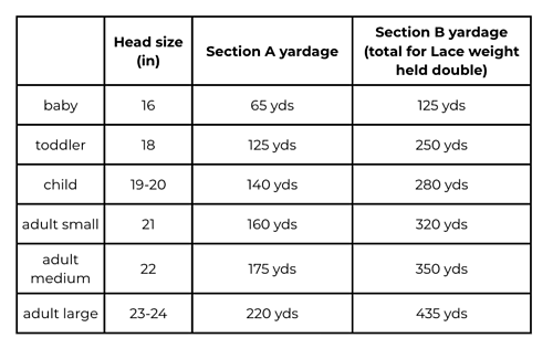 YARN - more details for the yardage for each size are shown in the chart in the photos to the right