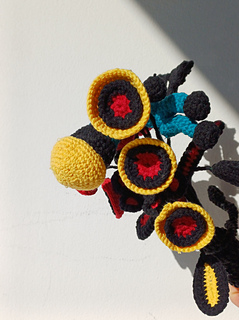 Vocira is a little sun that escaped from a distant planet and decided to bloom in yarn. Bright at the center, shadowy around the edges, she has a way of lighting up a space without ever trying.