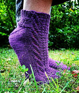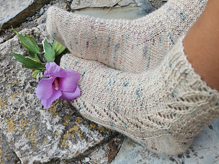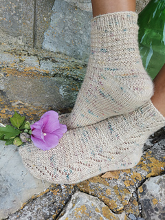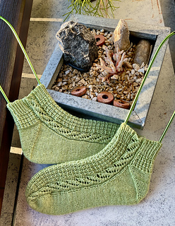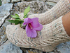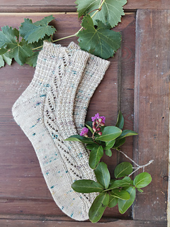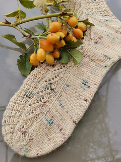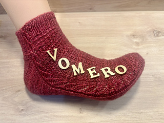 Vomero socks are knit toe up with a fleegle heel. The leaf pattern begins from the toe and runs up to the cuff while the rest of the instep and the leg are covered by the cobblestone pattern.