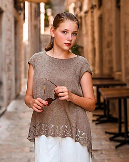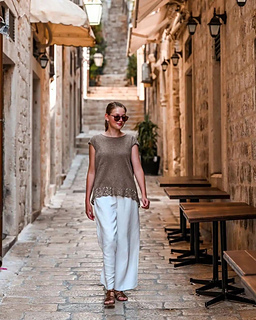 The Vroda top is worked from the bottom up to the armhole in one piece in back- and forth rows. At armhole level, work is divided, and front and back are worked separately, then shoulders are joined using the three-needle bind-off method.