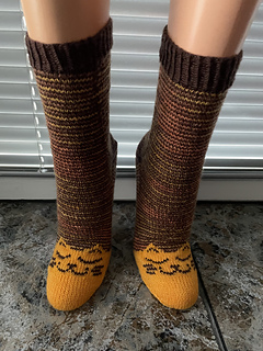 The “Vroni” pattern lets you knit cute striped socks with a cat face motif. Worked cuff down on DPNs, perfect for leftover yarn and cat lovers!