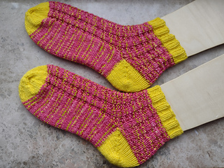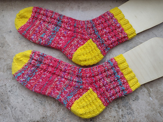 Garn: Sockengarn 4-fädig doppelt gehalten. Du brauchst mindestens zwei verschiedene Farben. Schön ist es, wenn du für Ferse und Spitze die Farbe(n) wechselst. Du kannst auch mit deinen Resten stricken, das macht tolle Effekte.