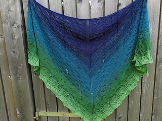 Das Dreieckstuch “Waldsee” wird aus einem Farbverlaufsbobbel gestrickt und von oben begonnen. Zuerst wird der See im Wellenmuster gestrickt, anschließend wird auf das Bäumemuster in Grün gewechselt.