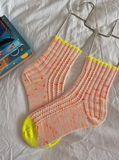 Softly textured, the Wandering Fable socks follow a quiet, climbing path. A new twisting column is added every few rows, allowing the pattern to grow slowly and organically. No two paths are the same, and with the mirrored construction of this pattern, each sock becomes it’s own wandering version of the tale.