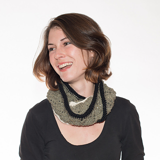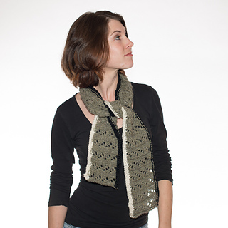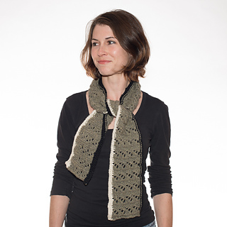 The Waterfall Scarf is a small scarf knit in an easy repeating lace pattern with a contrasting reverse stockinette stitch trim in black and white.