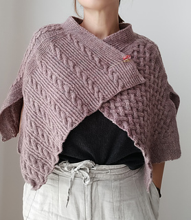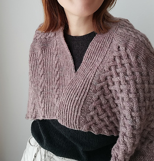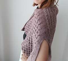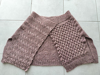 It starts at the middle of the top ribbing worked in two ways, and the stitches are set aside. Then stitches are picked up along the top ribbing for the back panel that is worked from the top down. Stitches are picked up along the sides of the back panel for front panels, and the slits are created in the transitional garter stitch sections.