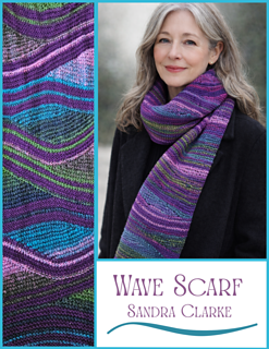 This pattern creates wavy movement using colour and short row knitting. You will be making a contemporary wide scarf. The entire scarf is in garter stitch. The pattern is written in sections. There are four different types of sections; (1) Complete Rows: Straight back and forth knitting with colour changes (using both solid colour yarn and variegated colour yarn). (2) Right Wave: Short rows working on the right side of the garment. Resembles a triangle. (3) Left Wave: Short rows working on the left side of the garment. Resembles a triangle. (4) Centre Wave: Short rows working in the centre of the garment. Sandra@SandraClarke.ca