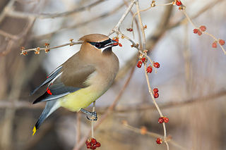 The Cedar Waxwing is my favorite bird. It’s such a thrill to see a flock of them in a berry tree. The distinctive red, waxy-looking tips on their wing feathers are actually hardened secretions of astaxanthin, a carotenoid pigment derived from their berry-based diet. Breeding pairs of cedar waxwings perform a ritual on tree branches, passing a single berry or flower petal back and forth. They are also rather well-known for becoming intoxicated after overindulging on fermented fruit. So they are interesting as well as beautiful!