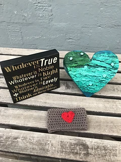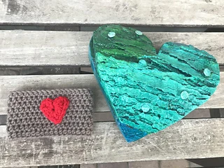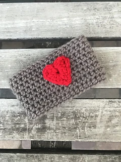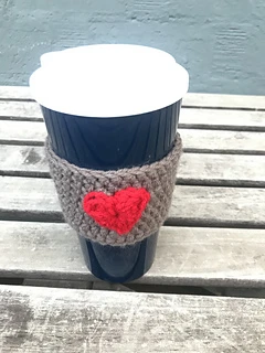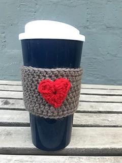 The Coffee Cozy is worked from the bottom up, and the heart is one round worked separately and sewn on to the cozy.