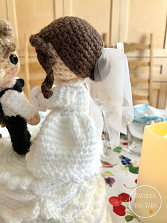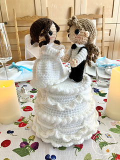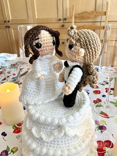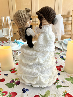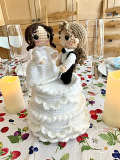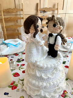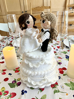 The pattern contains steps-by-steps instructions to crochet this adorable amigurumi wedding doll couple and wedding cake. The pattern has 13 pages and many pictures to help you along the way. Hair colour and skin-toned are customizable and the groom’s ponytail is optional.