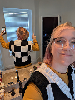 Hi to all my fellow knitters! It seems like a lot of young people are really captivated by the bold style and signature monochromatic wardrobe of this character in the new adaptation, so I decided to give it a try and knit a vest inspired by one I’ve seen her wear. I liked the checkered vest in black and white, the one with the large square. It has a simple design, it’s oversized-which is very trendy nowadays, and I thought it would look great on my daughters if any of them would like to wear it. So, I grabbed some medium worsted yarn and got to work. I made the squares approximately the same as what I’ve seen in the pictures of the original design, and I’m quite satisfied with how the final look turned out. It looks oversized on my youngest (as seen in the pictures, she’s a size XS/S), and fitted on my eldest (size M), who kept wearing it when she came over for the holidays. Thanks to the original creator/designer of this outfit and for the show for bringing such simple garments back in fashion.