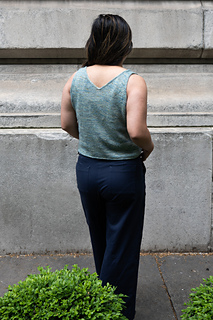 The Weekend Cami is a sleek, simple tank top with a moderate V-neck front, and a shallow V-neck back. It’s constructed top down and intended to be worn with negative ease at the chest and slight positive ease over the high hip. This cami was designed with a wider front than back to facilitate this close fit, and also includes an optional curvy view that has a wider front than the straight view, and optional bust darts, so that it can fit effortlessly for those with a larger bust size.