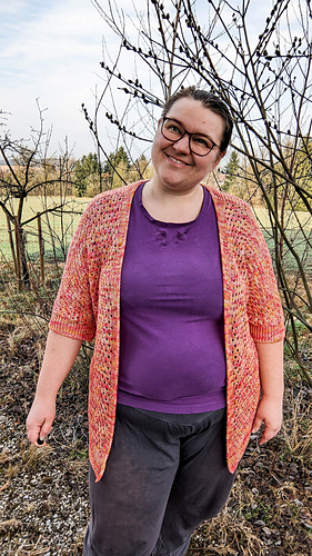 Dieses kurze leichte Jäckchen bringt Farbe und Frische in Deine Garderobe! Mit seinem luftigen Muster und den fröhlichen Frühlingsfarben ist es der perfekte Begleiter für kühle Tage – nicht nur im Frühjahr, sondern das ganze Jahr über.