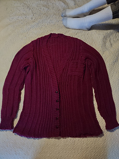 Worked at a tension of 4 sts. to the inch in width on the plain knitting, and using No. 4 needles; the following measurements are attained after light pressing: Across the back, 17 inches; across each front at the same place, 8 inches; front length from shoulder-seam to lower edge, 23 inches; back length, 21 inches; side-seam, 15 inches; sleeve-seam, 17 inches. (Note that the ribbed pattern in this thick wool slightly contracts the work, hence the smaller size than the tension would imply.)