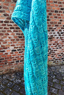 West End Wrap is an asymmetrical triangular scarf. We start at one corner and knit to the big side. The cable pattern has a width of about 20 cm. A tutorial shows you how to knit the pattern without a cable needle. Try it, it works!