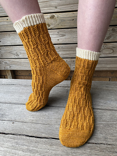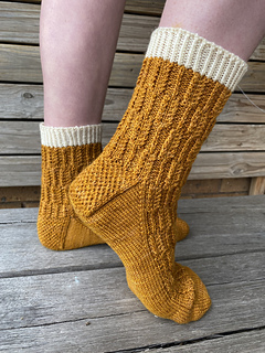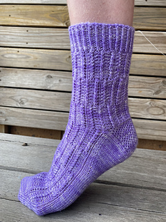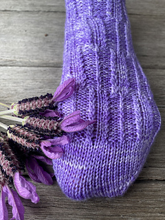 This pattern is designed to be knitted toe-up with a heel flap and gusset construction and a simple textured pattern on the instep and leg. The pattern has been used to look like wheat or lavender and uses simple right and left twisted stitches to great effect. There are two ways listed to knit each type of twisted stitch, and charts/written instructions are included for each size.