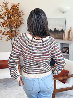 Once the yoke is complete, the stitches are divided to separate the sleeves from the body. The body is then crocheted downward to the hem ribbing, while the sleeves are completed individually and finished with ribbed cuffs for a clean, structured look.