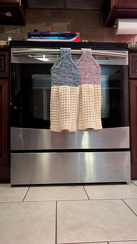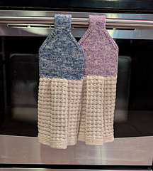 CC: 1 skein Sunshower Cotton by Purl Soho (100% Organically Grown Cotton; 159 yards/ 100 grams). Colorway: Purple Hyssop (purple towel) and Upper Atmosphere (blue towel); OR approximately 66 yards worsted weight cotton yarn.