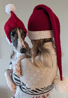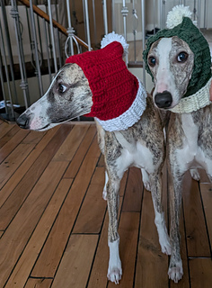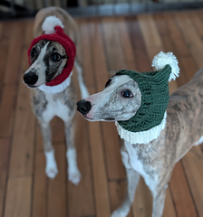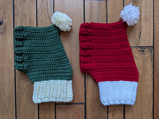 Sample shows white neck with red body and face cuff (Lion Brand Pound of Love, White and Cherry), or cream neck with green body and face cuff (Lion Brand Pound of Love, Antique White; Tent Sale, Forest). Pompoms made with the same yarn as neck cuffs (3.5 cm pompom maker). For a matching hat for yourself using the same yarns, please see my “Ivory Gull” pattern on Ravelry.