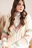 A soft, relaxed sweater featuring gentle pastel colorwork arranged in a clean V-shaped motif and balanced stripes along the sleeves.