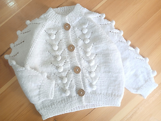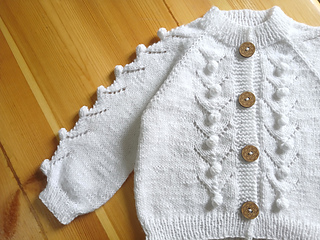 This sweet and cozy cardigan is worked seamlessly from the top down using the raglan method, creating a smooth and comfortable fit for little girl. The front panels and sleeves are adorned with a charming textured motif featuring bobbles and delicate stitches that add a playful, cloud-like feel to the design.