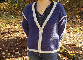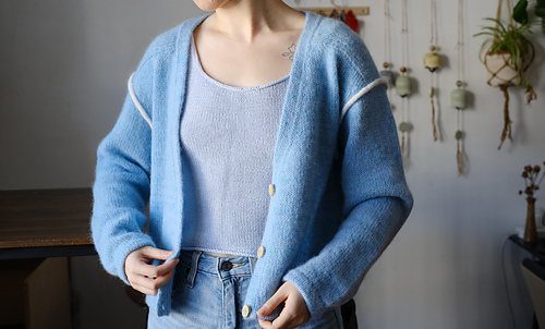 The double knit button band and the folded over edges give an elegant and sturdy finish for a clean and timeless look. The main detail that stands out is the eye-catching but simple ring around the armholes, created with a tuck-stitch technique using a contrasting color.