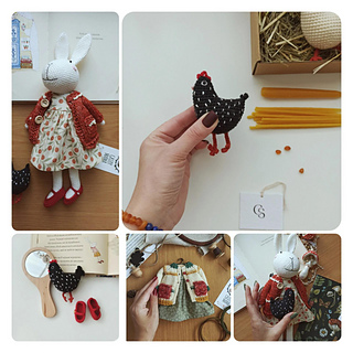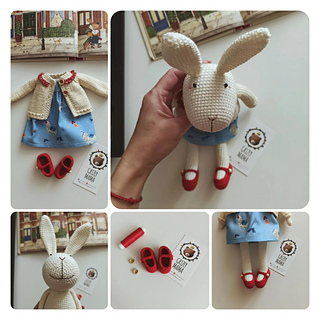 The White Rabbit pattern includes a detailed description of all stages of toy creation accompanied by a photo. Includes a list of required materials with numbered items of yarn. The pattern includes a description of the clothes - a dress, a blouse with pockets and shoes. I will be happy to answer your questions