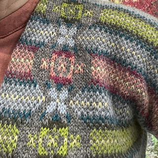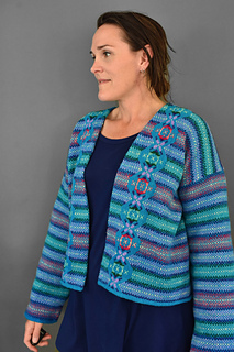 a Size A or size B crochet hook to work a surface crochet along the shoulder seams; spare interchangeable cables or spare needles or scrap yarn for holding stitches; stitch markers; scissors for steeking; crochet hook and suitable scrap yarn OR needle and thread OR sewing machine OR felting tool and board for reinforcing steeks.