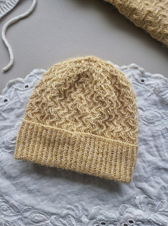 Wild oats beanie strikkes fra brettekanten og opp. Det felles gradvis i strukturen mot toppen av luen. Brettekant brettes opp til slutt.