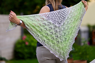 This shawl is a wide triangle knit from the top-down all in one piece. Being a true lace, there is double-sided patterning in the Glacier Lily motif. You can easily adjust the size by varying body repeats.