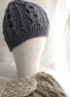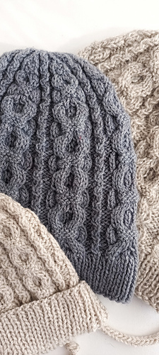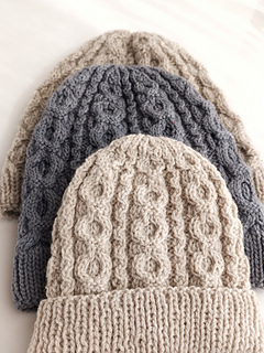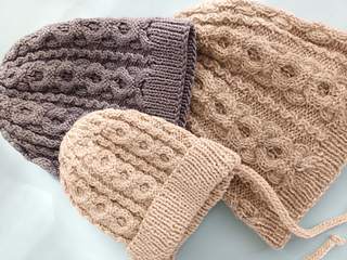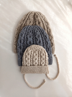 A classic cabled beanie worked in the round from the brim up. The brim transitioned into repeating cable panels across the body. Crown shaping is integrated into the cable pattern. Shown in multiple sizes; smallest Baby size includes optional ties for secure wear. Works well in wool or wool-blend yarns with good stitch definition.