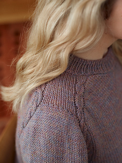 The sweater is knitted seamlessly from the top down. The shoulders are shaped with increases, while the neckline is formed using German Short Rows. After shoulder increases, shaping continues with sleeve and body increases. The mirrored cables are first worked on the shoulders, then they shift to the body, framing the sleeves, and then after the separation run down the sides of the body. The body is worked straight and finished with 1 x 1 Rib. The sleeves are worked in Stockinette Stitch with shaping and end in rib as the body. The neck is finished with a 1 x 1 Rib collar.