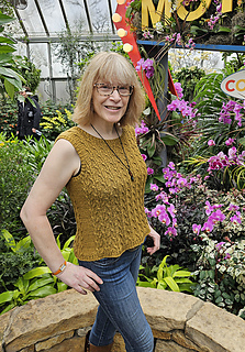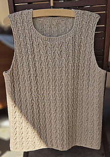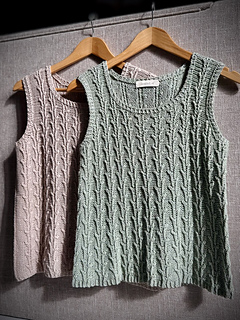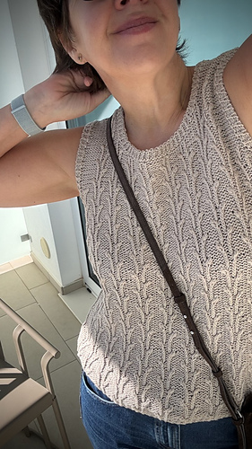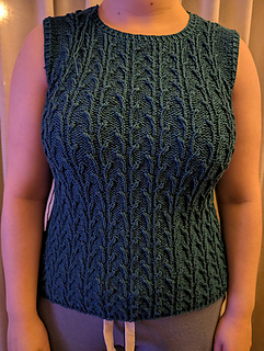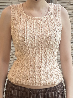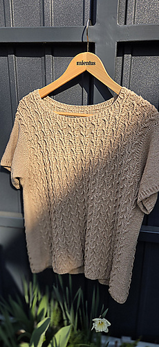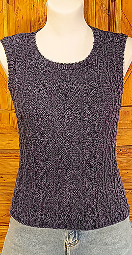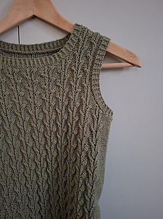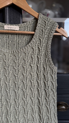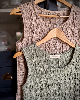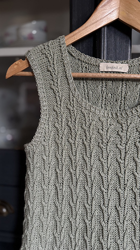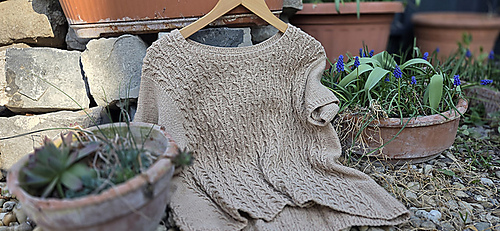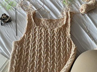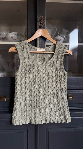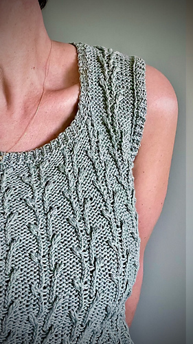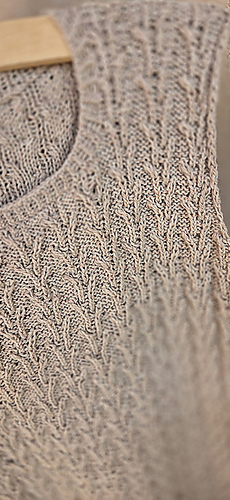 Worked from the bottom up in the round in a breathable cotton–linen blend, it features a subtle botanical stitch pattern that adds texture and a soft, graceful drape.