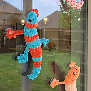 No Sew Lizard Window Buddy that can be suctioned to any smooth surface. He has been tested with Bernet Blanket and Premier Basix yarns, using smaller yarn will result in a smaller lizard